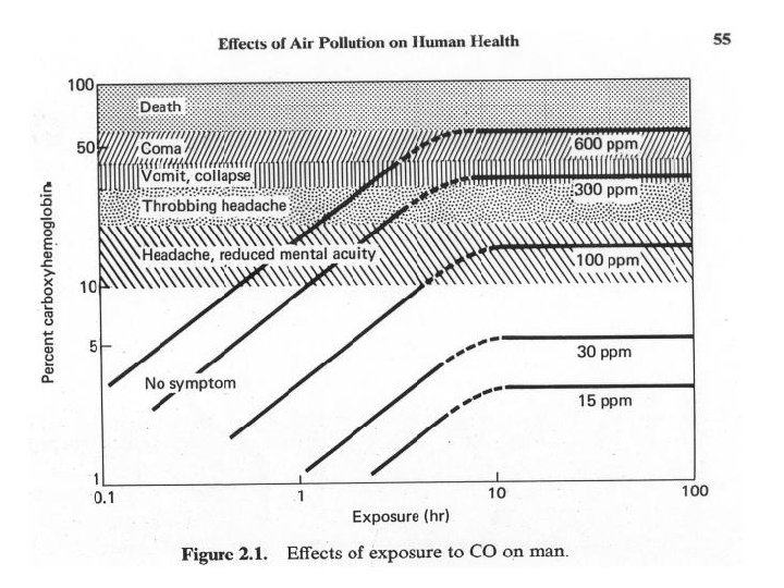 3. Carbon Monoxide, CO criteria pollutant Primary Effects: 1. Respiration (acute); EPA Criteria Pollutant 2. Cardiovascular system (chronic) 3. Contributor to photochemical smog 4. Changes global HOx cycle (oxidizing capacity of atmosphere). Limits: 9. 0 ppm for 8 hr 35 ppm for 1 hr 50 ppm for 8 hr is the "level of significant harm"