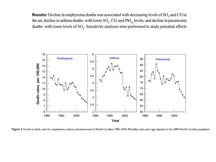 1. Ozone, O 3 (Photochemical Oxidant) criteria pollutant Secondary • Effects: 1. Respiration - premature aging of lungs (Bascom et al. , 1996); mortality (e. g. , Jerrett et al. , 2009). 4%/10 ppb. 300, 000 deaths/yr (Landrigan et al. 2017) 2. Phytotoxin, i. e. Vegetation damage (Heck et al. , JAPCA. , 1982; Schmalwieser et al. 2003; Mac. Kinzie and El-Ashry, 1988) 3. Materials damage - rubber 4. Greenhouse effect (9. 6 m) • Limit: (National Ambient Air Quality Standard) 80 ppb for 1 hr. 1971 120 ppb for 1 hr. 1979 84 ppb for 8 hr 1997 75 ppb for 8 hr 2010 70 ppb for 8 hr 2015 • Ozone is an indicator of smog. • Ozone regulates many other oxidants