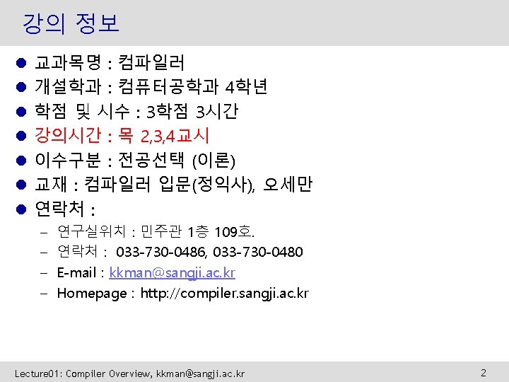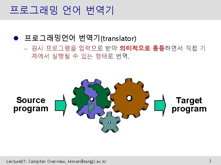 Lecture 01: Compiler Overview Kwang-Man Ko kkmam@sangji. ac. kr, compiler. sangji. ac. kr Department of Computer Engineering Sang Ji University 2018