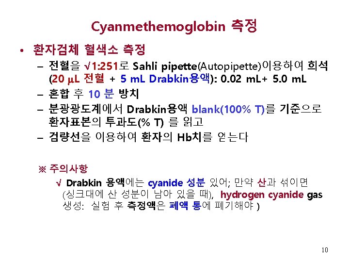 Cyanmethemoglobin 측정법 - 계속 표준검량선(Standard Curve) 준비 표준검량선 준비요령 (예): 20 g/d. L 표준액 이용 시 √ Cyanmet. Hb표준액: 기지농도(20) g/d. L Hb Eq. 표준액. √ 아래 도표대로, Cyanmet. Hb표준액과 Drabkin sol 이용하여 5단계 농도(blank, 5 g/d. L, 10 g/d. L, 15 g/d. L, 20 g/d. L) tube 준비 Drabkin sol으로 희석한 후의 각 표준 Hb농도(g/d. L) Tube #1 Tube #2 Tube #3 Tube #4 Tube #5 0 g/d. L (Blank) 5 g/d. L 10 g/d. L 15 g/d. L 20 g/d. L (1: 4 dilution) (1: 2 dilution) (3: 4 dilution) (Undiluted) Hb 20 g/L Eq. Cyanmet Hb 표준액 0 m. L 1. 5 m. L 3 m. L 4. 5 m. L 6 m. L Drabkin solution 6 m. L 4. 5 m. L 3 m. L 1. 5 m. L 0 m. L 7