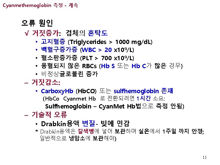 Cyanmethemoglobin 측정법 - 계속 표준검량선 - Drabkin sol blank (100% T) blank : 5 g/d. L: 10 g/d. L: 15 g/d. L: 20 g/d. L: 100 % T 72. 9% T 53. 2% T 39. 1% T 28. 7% T % Transmittance 를 기준으로 각 표준액에서의 투과도(%T) 값을 읽어 기록 • Tr(%) read in each tubes - Semilog paper에 X-축의 각 표준액 농도에서의 해당 %T값 들을, Blank 각각 Y-축에 표시한 후, (Drabkin sol) 검량선 완성 0 Hemoglobin Concentration (g/d. L) Fig 14 -5: : Rodak, Fritsma, Keohane: Hematology: Clinical Principles and Applications , Elsevier items and derived items © 2012, 2007, 2003 by Saunders, an imprint of Elsevier, Inc p. 178 9