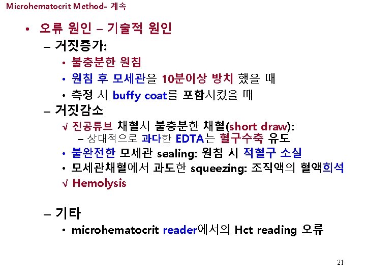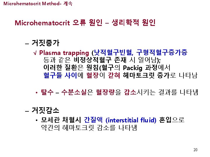 Microhematocrit Method- 계속 Microhematocrit 참고범위 √ 참고범위 • Male 0. 40 -0. 54 L/L 40 -54% • Female 0. 35 -0. 49 L/L 35 -49% • Newborns 0. 48 -0. 68 L/L 48 -68% 19