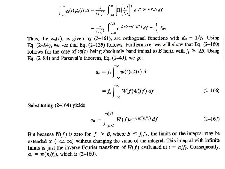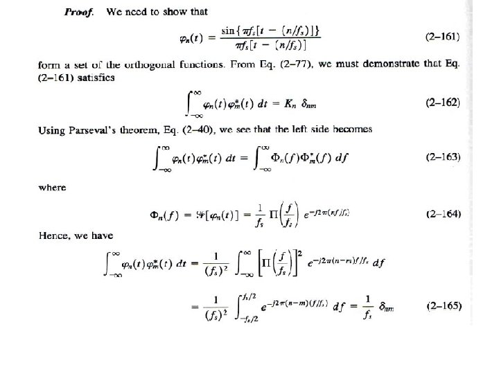 Sampling Theorem Ø The MINIMUM SAMPLING RATE allowed for reconstruction without error is called the NYQUIST FREQUENCY or the Nyquist Rate. Ø Suppose we are interested in reproducing the waveform over a T 0 -sec interval, the minimum number of samples that are needed to reconstruct the waveform is: • There are N orthogonal functions in the reconstruction algorithm. We can say that N is the Number of Dimensions needed to reconstruct the T 0 -second approximation of the waveform. • The sample values may be saved, for example in the memory of a digital computer, so that the waveform may be reconstructed later, or the values may be transmitted over a communication system for waveform reconstruction at the receiving end.