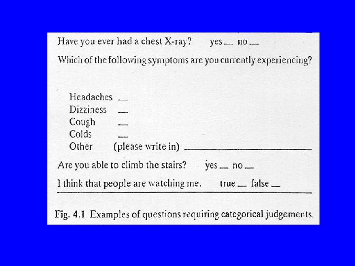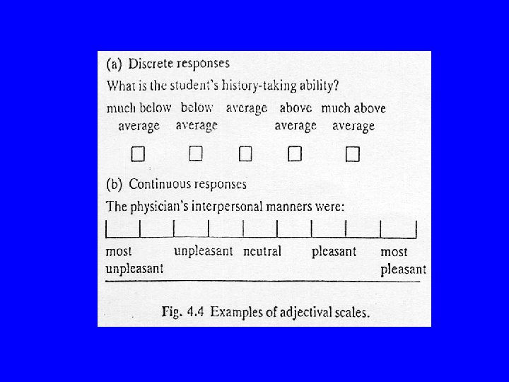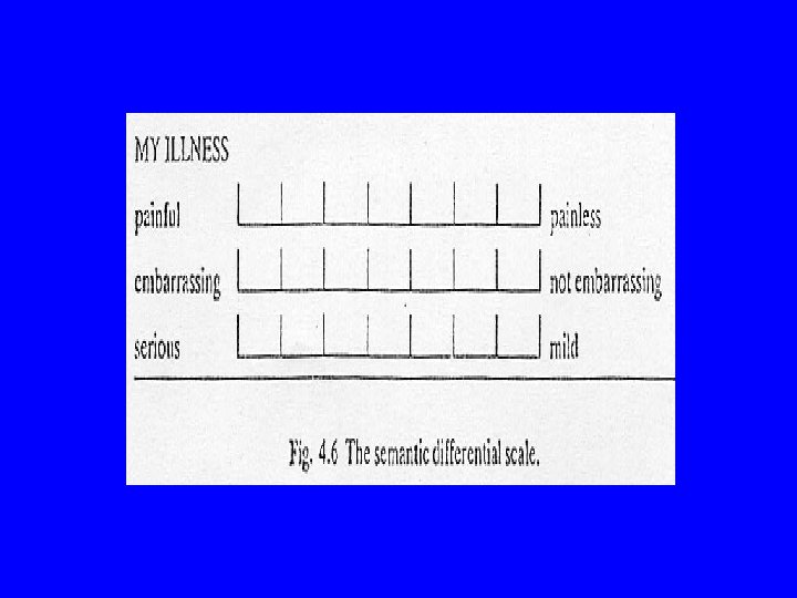 Continuous response scales in questionnaires • • Visual analogue scale Adjectival scale Likert scale Semantic differential scale