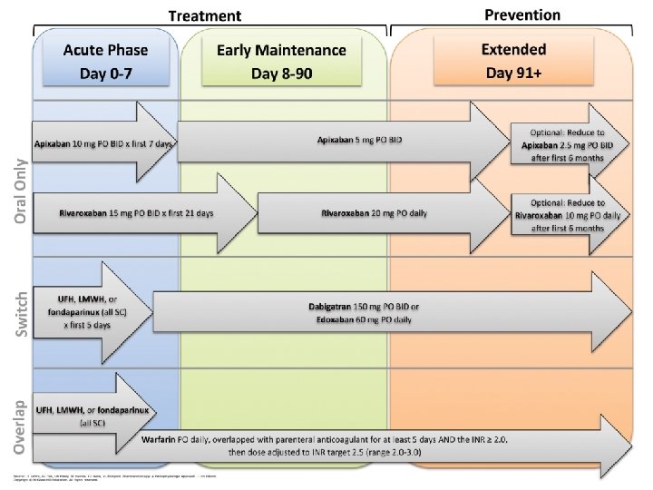 • Recommended doses (based on actual body weight) include: ✓ Enoxaparin (Lovenox): For acute DVT treatment with or without PE, 1 mg/kg SC every 12 hours or 1. 5 mg/kg every 24 hours ✓ Dalteparin (Fragmin): For acute DVT treatment, 200 units/kg SC every 24 hours (not FDA approved in the U. S. for this indication). For VTE in patients with cancer, 200 units/kg SC every 24 hours for 30 days, followed by 150 units SC every 24 hours. The maximum total daily dose is 18, 000 units. • In patients without cancer, acute LMWH treatment is generally transitioned to long-term warfarin therapy after 5 to 10 days.