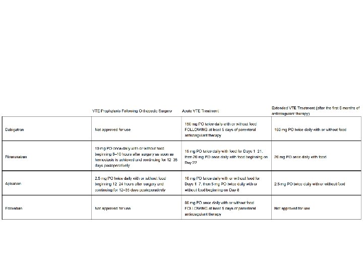 Direct Oral Anticoagulants (DOACs) • Rivaroxaban, apixaban, and edoxaban are oral selective inhibitors of both free and clotbound factor Xa and do not require antithrombin to exert their anticoagulant effect. Dabigatran (Pradaxa) is an oral selective, reversible, direct factor IIa inhibitor. • DOACs should be used with caution in patients with renal dysfunction. • Single-drug oral therapy with rivaroxaban or apixaban is noninferior to traditional therapy with warfarin overlapped with enoxaparin for acute DVT and PE with similar rates of recurrent VTE and perhaps less major bleeding. Both drugs are initiated with a higher dose with eventual transition to maintenance dosing. • Until further data are available, these drugs should not be used in patients with creatinine clearance (Cr. Cl) less than 25 m. L/min (0. 42 m. L/s), active cancer, and patients requiring thrombolytic therapy. Neither drug requires routine anticoagulation monitoring. Both drugs have a high acquisition cost. • Edoxaban and dabigatran must be given only after at least 5 days of subcutaneous (SC) anticoagulation with UFH, LMWH, or fondaparinux. • These regimens were noninferior to warfarin in patients with acute VTE for the outcome of recurrent VTE.