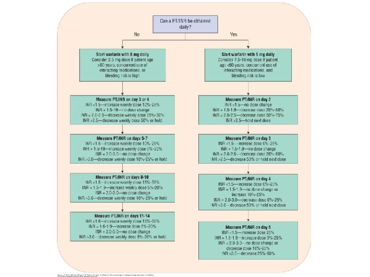 Warfarin • Warfarin inhibits enzymes responsible for cyclic interconversion of vitamin K in the liver. • Because of its slow onset of effect, warfarin must be started concurrently with injectable anticoagulant therapy (UFH, LMWH, or fondaparinux) with an overlap of at least 5 days and until an INR of 2 or greater has been achieved for at least 24 hours. • The initial warfarin dose should be 5 to 10 mg for most patients and periodically adjusted to achieve and maintain an INR between 2 and 3. • Lower starting doses may be acceptable in patients with advanced age, malnutrition, liver disease, or heart failure. Starting doses more than 10 mg should be avoided. • In general, maintenance dose changes should not be made more frequently than every 3 days. Adjust maintenance doses by calculating the weekly dose and reducing or increasing it by 5% to 25%. The full effect of a dose changes may not become evident for 5 to 7 days. • Nonhemorrhagic adverse effects of warfarin include the rare “purple toe” syndrome and skin necrosis. • Because of the large number of food–drug and drug–drug interactions with warfarin, close monitoring and additional INR determinations may be indicated whenever other medications are initiated, discontinued, or an alteration in consumption of vitamin K– containing foods is noted.