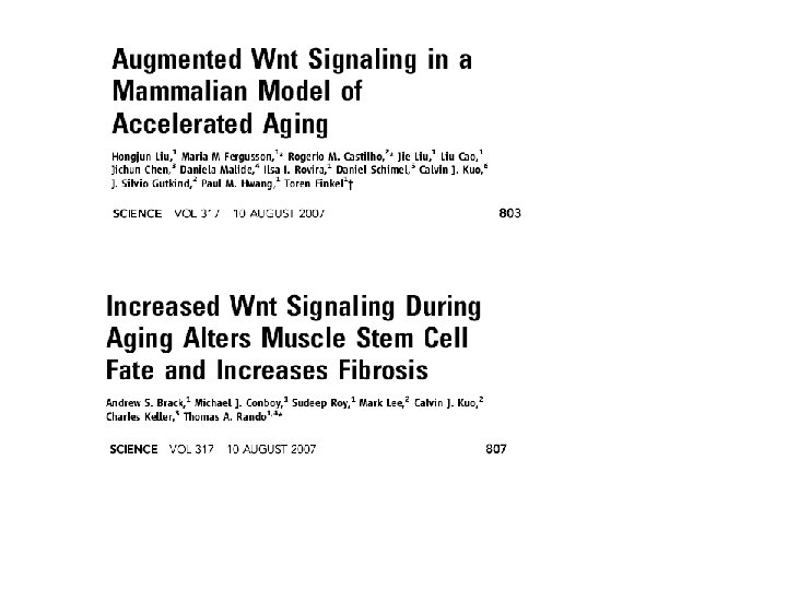 Klotho myš -mutantní kmen myši s fenotypem akcelerovaného stárnutí: např. kratší život, arterioskleróza, snížená plodnost nebo kožní atrofie - protein Klotho je transmembránový protein s velkou extracelulární doménou, ta může být odštěpena a volně cirkulovat v krvi aktivita Wnt/ -cateninové dráhy ve střevním epitelu