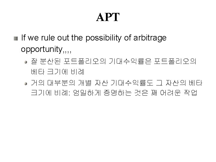 Multi-factor APT can be easily extended to a multi-factor version. Return on security I is determined by the following MFM Then, the expected return on a well-diversified portfolio is proportional to a linear combination of its betas: APT