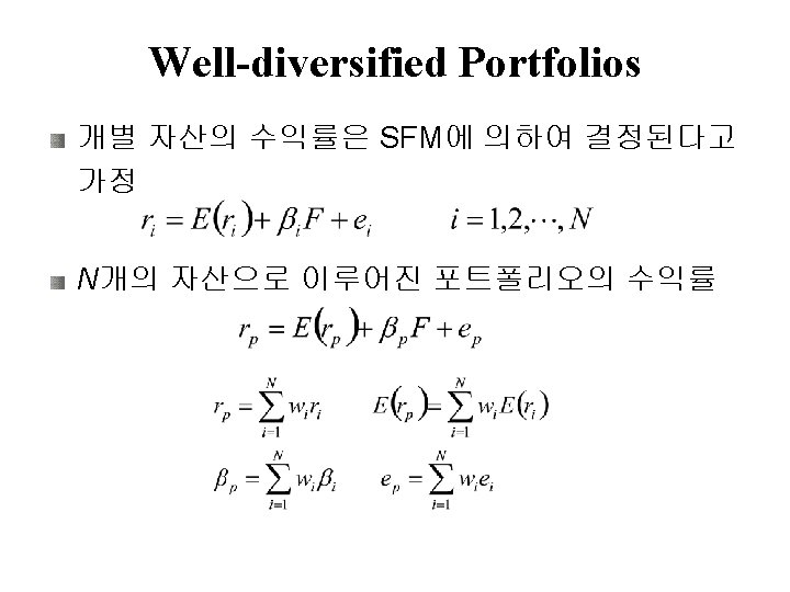 Multi-factor Models Why one factor? Isn’t it better to allow multiple factors? SFM: market return을 factor로 사용 MFM: market return, GDP growth, interest rate etc. N-factor model Can estimate the factor loadings(betas) through multiple regression approach