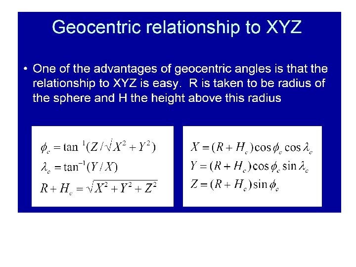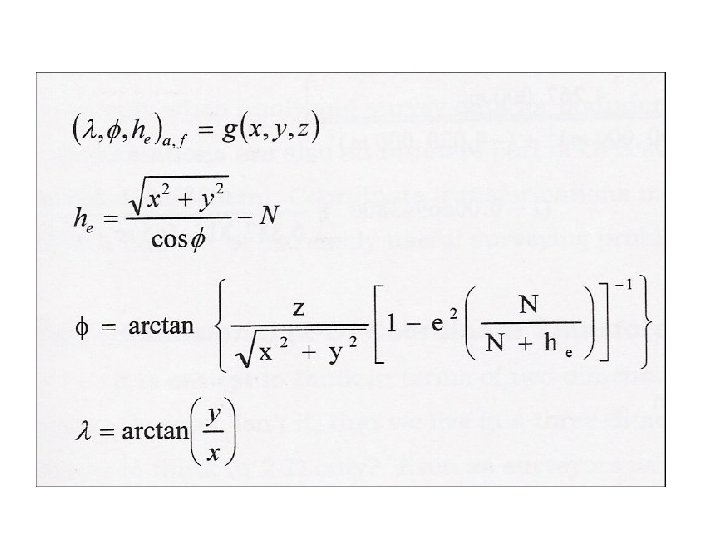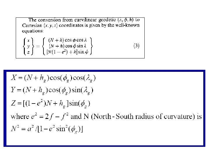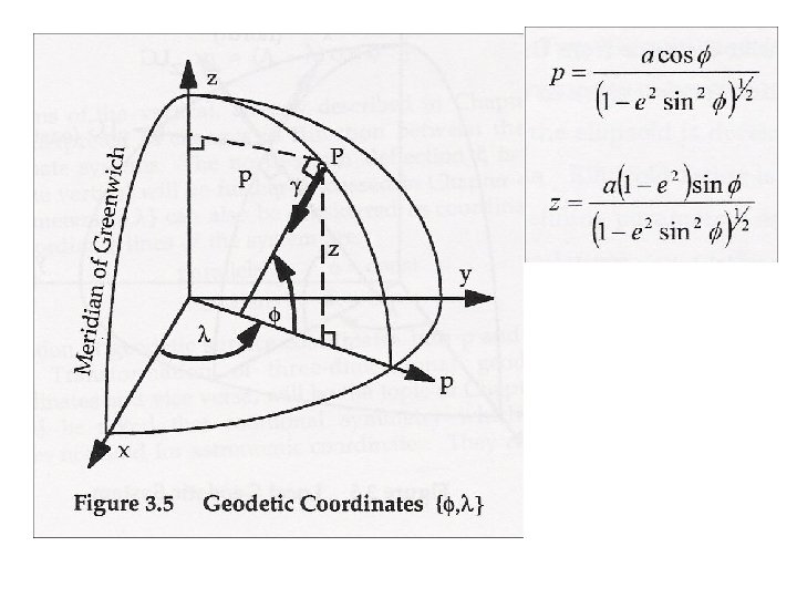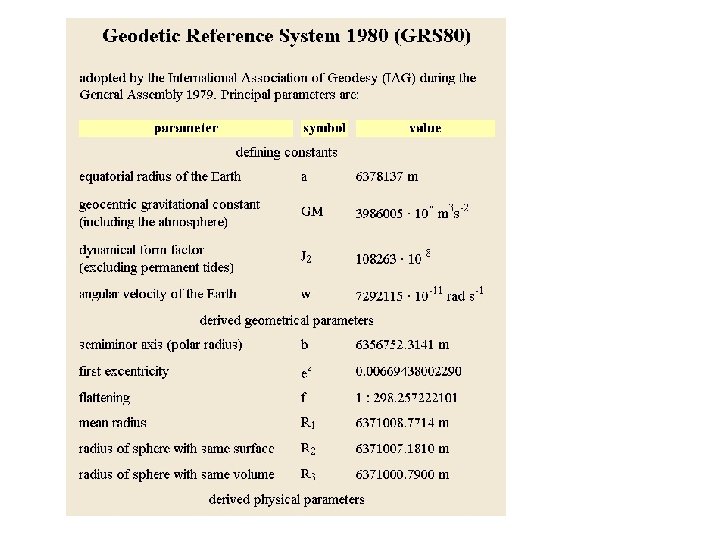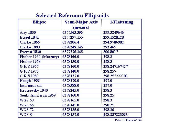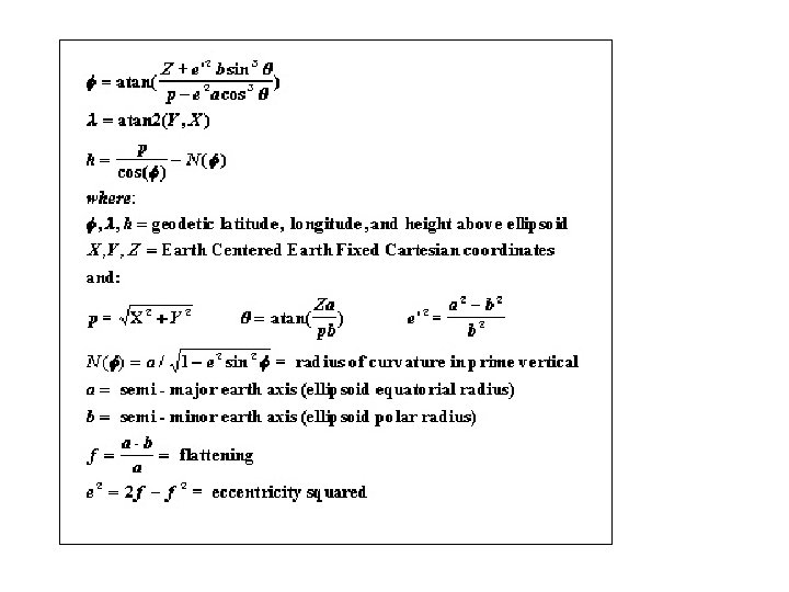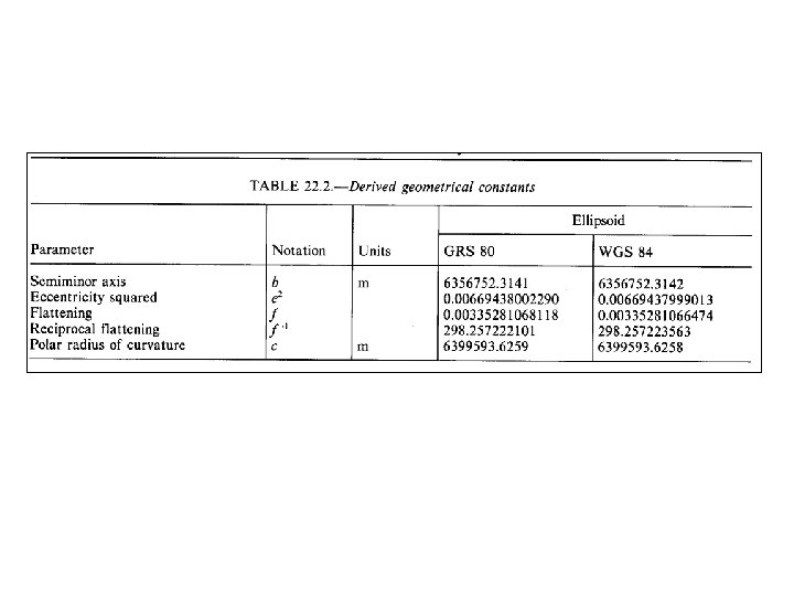 Parameters • • • a = semi-major axis length b = semi-minor axis length f = flattening = (a-b)/a e = first eccentricity = √((a 2 -b 2)/a 2) e’ = second eccentricity = √((a 2 -b 2)/b 2)
