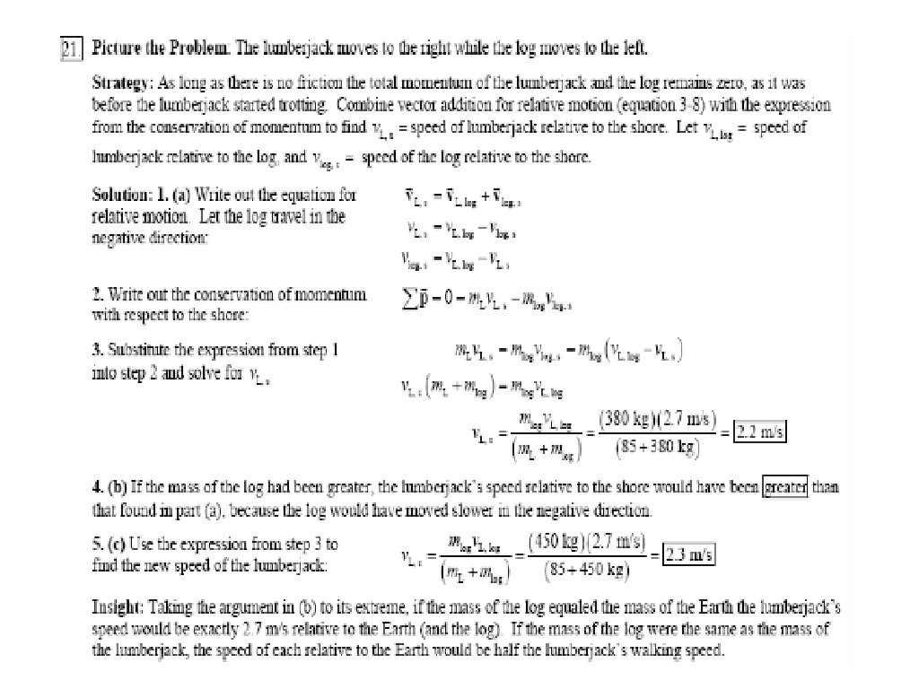 An 85 -kg lumberjack stands at one end of a 380 -kg floating log, as shown in the figure. Both the log and the lumberjack are at rest initially. (a) If the lumberjack now trots toward the other end of the log with a speed of 2. 7 m/s relative to the log, what is the lumberjack’s speed relative to the shore? Ignore friction between the log and the water. (b) If the mass of the log had been greater, would the lumberjack’s speed relative to the shore be greater than, less than, or the same as in part (a)? Explain. (c) Check (b) by assuming log has mass of 450 kg.