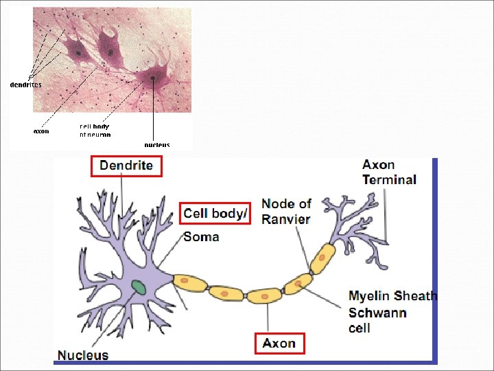 Fourth: Nervous tissues ﺍﻷﻨﺴﺠﺔ ﺍﻟﻌﺼﺒﻴﺔ Nervous tissue is the main component of the nervous system. The functional unit of nervous tissue is the neuron ﺍﻟﻨﻴﻮﺭﻭﻥ , or nerve cell. It consists of three parts: a cell body ﺟﺴﻢ ﺍﻟﺨﻠﻴﺔ , a single axon ﺍﻟﻤﺤﻮﺭ and dendrites ﺍﻟﺰﻭﺍﺋﺪ ﺍﻟﻌﺼﺒﻴﺔ Dendrites transmit nerve impulses from their tips toward the rest of the neuron. Axons transmit impulses toward another neuron, muscles or glands.
