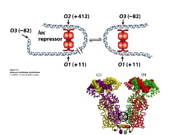 In bacteria: Even though lactose, arabinose and other sugars may be available for the cell, in the presence of glucose the production of enzymes metabolizing sugars other than glucose is repressed. This is known as catabolite repression. lac operon contains 3 genes necessary for consumption of galactose: (1) b-galactosidase, (2) galactoside permease and (3) thiogalactoside transacetylase There are positive and negative regulatory elements that make catabolite repression work. c. AMP receptor protein (CAP), acting as a homodimer can bind both c. AMP and DNA. When glucose is absent (high c. AMP state), CAP binds to its positive regulatory element increasing transcription of the lac operon 50 -fold. Lac repressor is a tetrameric complex that in the absence of lactose binds tightly to the operator region covering the transcription initiation site. In the presence of lactose or lactose mimicking substances (IPTG) it falls off.