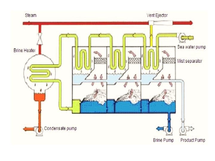 Multi Stage flash • Steam is used to heat tubes of saline water • Heated water flows into “stages” that are at lower pressure • Water boils rapidly and “flashes” into steam