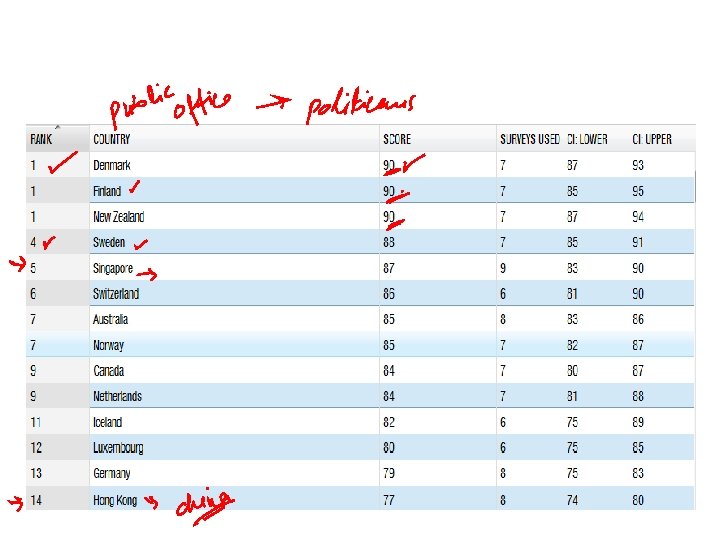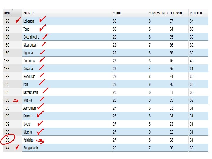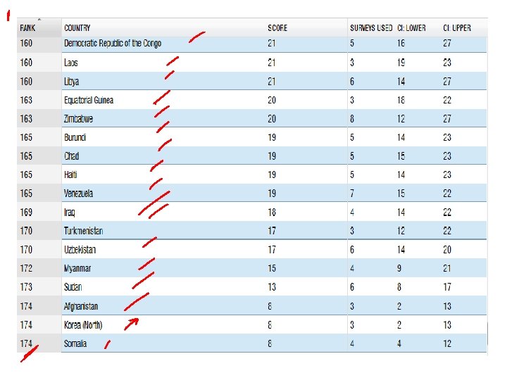 Corruption Perceptions Index • The index, which is published by Transparency International, reflects the degree to which corruption is perceived to exist among public officials and politicians. • Data is given for 2012.