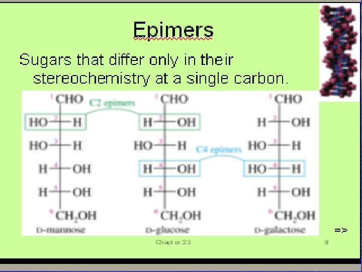 Isomers and epimers • Compounds that have the same chemical formula but have • different structures are called isomers. For example Fructose, glucose , mannose and galactose are all isomers of each other having the same chemical formula C 6 H 12 O 6. If two monosaccharides differ in configuration around only one specific carbon atom , they are defined as epimers of each other. For example, glucose and galactose are C 4 epimers, their structures differ only in the position of the hydroxyl group at C 4 ( Note , the carbons in sugar are numbered beginning at the end that contain the aldehyde or ketone group. Glucose and mannose are C 2 epimers. However, galactose and mannose are not epimers they differ in the position of the hydroxyl group at two carbon 2 and 4 and therefore, defined only as isomers. • Enantiomers: A special type of isomerism is found in the pairs of structures that are mirror images of each other. These mirror images are called enantiomers. The two members of the pair are called as D and L sugars. The majority of the sugars in human are D sugars.