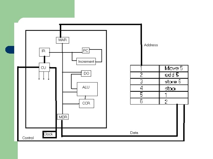 Add 5 Add the contents of memory address 5 to the data already stored in A. [MAR] [IR(operand)] As in the previous example, the operand is transferred to the MAR, and the contents of the memory location pointed by the MAR are buffered in the MBR. [MDR] [M([MAR])] At this point A and MBR store the data need for this instruction. To perform the addition, a control signal is set to the Arithmetic Logic Unit (ALU) where the addition is performed.