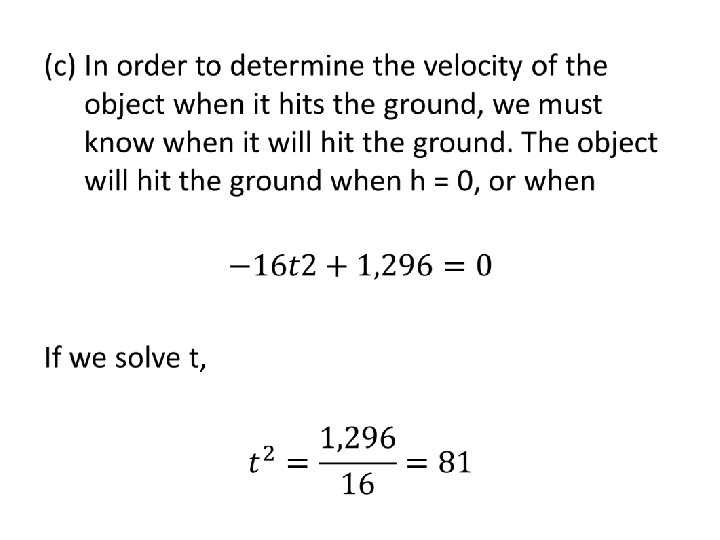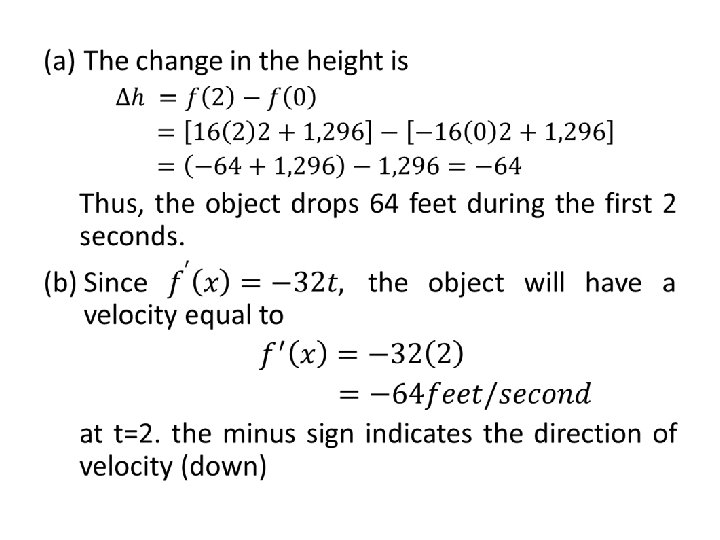 (a) How far will be object drop 2 seconds? (b) What is the instantaneous velocity of the object at t = 2? (c) What is the velocity of the object at the instant it hits the ground?