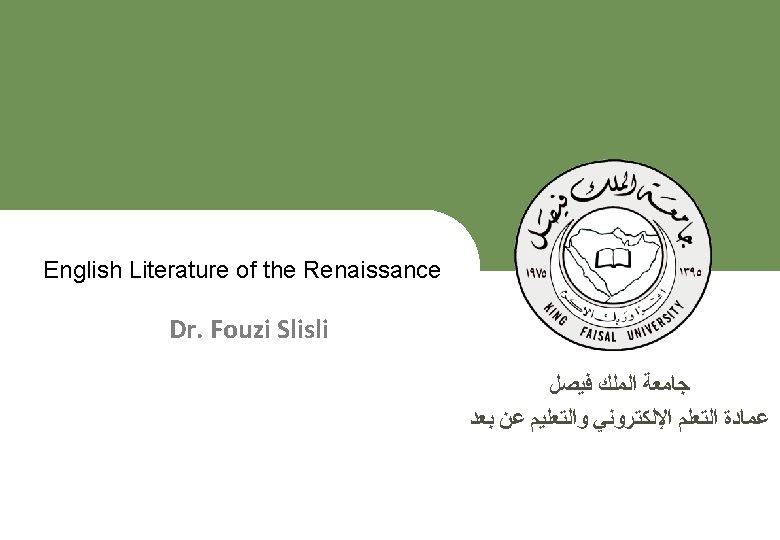 Metaphysical Poets v The name given to a diverse group of 17 th century English poets whose work is notable for its ingenious (clever) use of intellectual and theological concepts in surprising CONCEITS, strange PARADOXES, and far-fetched IMAGERY. v The leading metaphysical poet was John Donne, whose colloquial, argumentative abruptness of rhythm and tone distinguishes his style from the CONVENTIONS of Elizabethan love-lyrics. Other poets to whom the label is applied include Andrew Marvell, Abraham Cowley, John Cleveland, and the predominantly religious poets George Herbert, Henry Vaughan, and Richard Crashaw. v In the 20 th century, T. S. Eliot and others revived their reputation, stressing their quality of WIT, in the sense of intellectual strenuousness and flexibility rather than smart humour. The term metaphysical poetry usually refers to the works of these poets, but it can sometimes denote any poetry that discusses metaphysics, that is, the philosophy of knowledge and existence. ﻋﻤﺎﺩﺓ ﺍﻟﺘﻌﻠﻴﻢ ﺍﻹﻛﺘﺮﻭﻧﻲ ﻭﺍﻟﺘﻌﻠﻢ ﻋﻦ ﺑﻌﺪ Deanship of E-Learning and Distance Education [ ] ﺟﺎﻣﻌﺔ ﺍﻟﻤﻠﻚ ﻓﻴﺼﻞ King Faisal University
