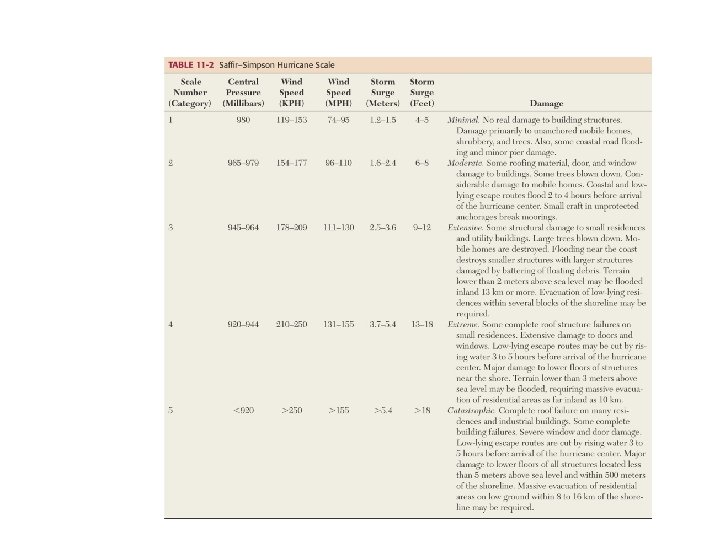 Table 7 u-1: Saffir-Simpson scale of hurricane intensity. Category Pressure (mb) Winds (mph) Winds (kmph) Surge (meters) Tropical Depression TD ----- < 39 < 62 ----- Tropical Storm TS ----- 39 -73 63 -118 ----- Hurricane 1 > 980 74 -95 119 -153 1. 2 -1. 5 Hurricane 2 965 -980 96 -110 154 -177 1. 6 -2. 4 Hurricane 3 945 -965 111 -130 178 -209 2. 5 -3. 6 Hurricane 4 920 -945 131 -155 210 -250 3. 7 -5. 4 Hurricane 5 < 920 >155 >250 >5. 4 Type