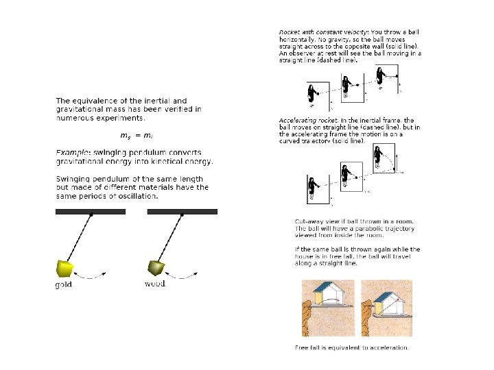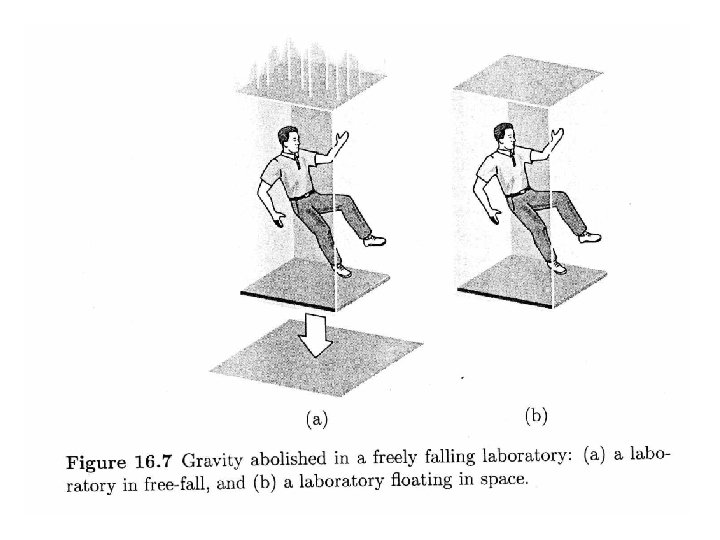 EQUIVALENCE PRINCIPLES • The weak equivalence principle: – All objects are observed to accelerate at the same rate in a given gravitational field. – Therefore, the inertial and gravitational masses must be the same for any object. – This has been verified experimentally, with fractional difference in masses 10 -11 • As a consequence, the effects of gravity and of inertial forces (fictitious forces associated with accelerated frames) cannot locally be distinguished