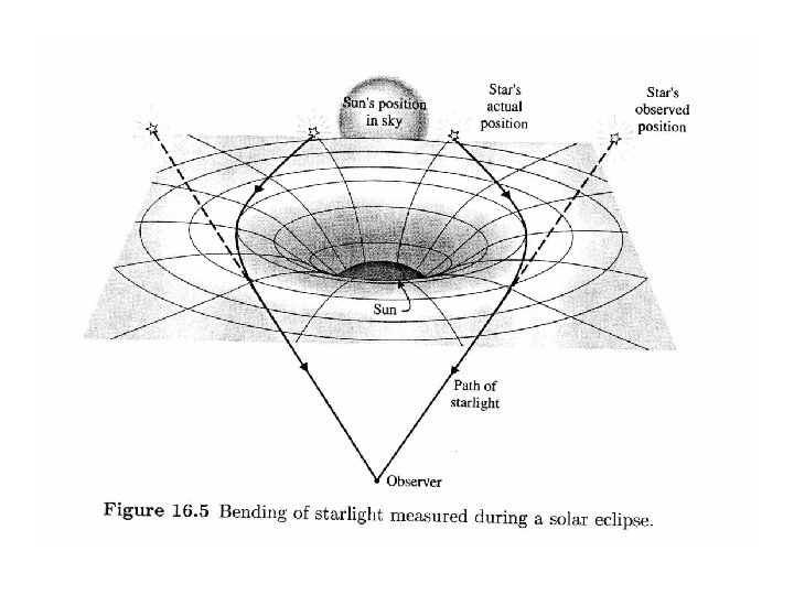Bending of starlight by Sun’s gravity Angle measured by Eddington Where star appears when Sun is elsewhere in sky
