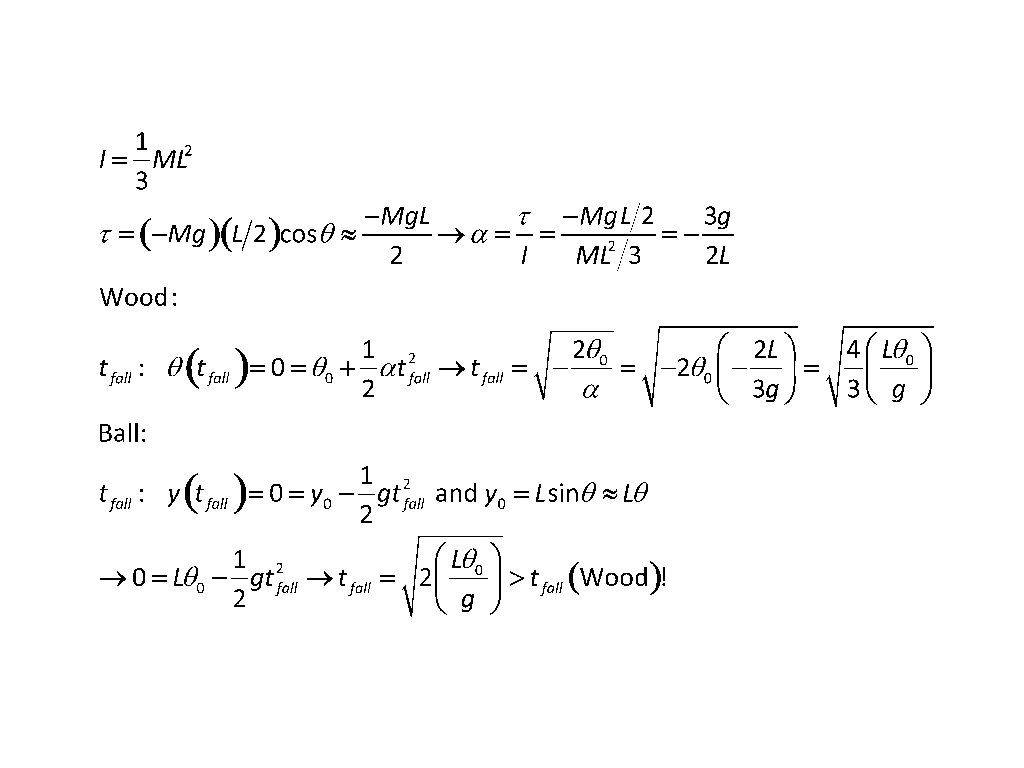 Balancing Rod a) ¼ kg A 1 -kg ball is hung at the end of a rod 1 -m long. If the system balances at a point b) ½ kg on the rod 0. 25 m from the end holding the c) 1 kg mass, what is the mass of the rod? d) 2 kg e) 4 kg The total torque about the pivot must be zero !! The CM of the rod same distance is at its center, 0. 25 m to the right of the pivot Because this must balance the ball, which is the same distance to the left of the pivot, pivot the masses must be the same !! m. ROD = 1 kg X 1 kg CM of rod