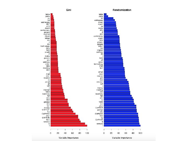 RF: Variable Importance Measures Record the prediction accuracy on the oob samples for each tree Randomly permute the data for column j in the oob samples the record the accuracy again. The decrease in accuracy as a result of this permuting is averaged over all trees, and is used as a measure of the importance of variable j in the random forest.