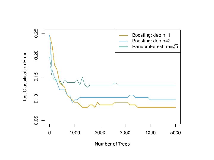 Boosting tuning parameters • The number of trees B. RF and Bagging do not overfit as B increases. Boosting can overfit! Cross Validation • The shrinkage parameter λ, a small positive number. Typical values are 0. 01 or 0. 001 but it depends on the problem. λ only controls the learning rate • The number d of splits in each tree, which controls the complexity of the boosted ensemble. Stumpy trees, d = 1 works well.
