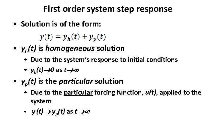 First order system step response • Solution is of the form: • yh(t) is homogeneous solution • Due to the system’s response to initial conditions • yh(t) 0 as t • yp(t) is the particular solution • Due to the particular forcing function, u(t), applied to the system • y (t) yp(t) as t