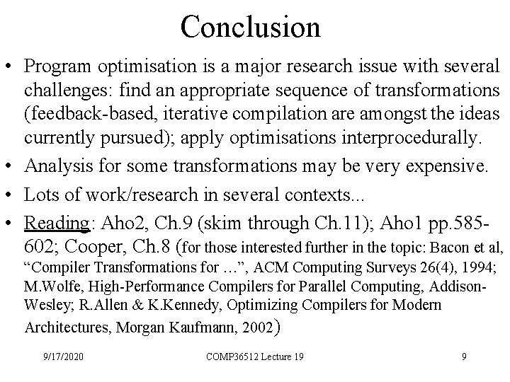 Conclusion • Program optimisation is a major research issue with several challenges: find an appropriate sequence of transformations (feedback-based, iterative compilation are amongst the ideas currently pursued); apply optimisations interprocedurally. • Analysis for some transformations may be very expensive. • Lots of work/research in several contexts. . . • Reading: Aho 2, Ch. 9 (skim through Ch. 11); Aho 1 pp. 585602; Cooper, Ch. 8 (for those interested further in the topic: Bacon et al, “Compiler Transformations for …”, ACM Computing Surveys 26(4), 1994; M. Wolfe, High-Performance Compilers for Parallel Computing, Addison. Wesley; R. Allen & K. Kennedy, Optimizing Compilers for Modern Architectures, Morgan Kaufmann, 2002) 9/17/2020 COMP 36512 Lecture 19 9