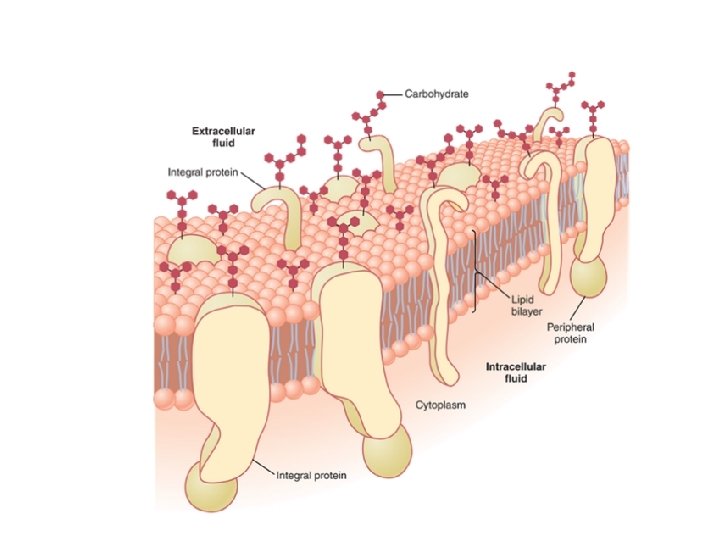 Transport through the cell membrane o Cell membrane is selectively permeable to some molecules & ions. n Not permeable to proteins, nucleic acids, & other molecules. o Lipid or fat-soluble substances, e. g. O 2, CO 2, OH; enter directly into cell membrane through the lipid bilayer. o Water-soluble substances, e. g. ions, glucose, water; enter through proteins of the cell membrane.