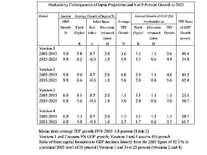 Perkins-Rawski (2007) • Try to predict growth over the next two decades. • Growth accounting: • TFP growth = g. Y – a. Kg. K -a. Lg. L • g. Y , g. K , g. L growth rates of GDP, capital and labor. • Shares of capital and labor a. K, a. L in total factor payments (in total national income).