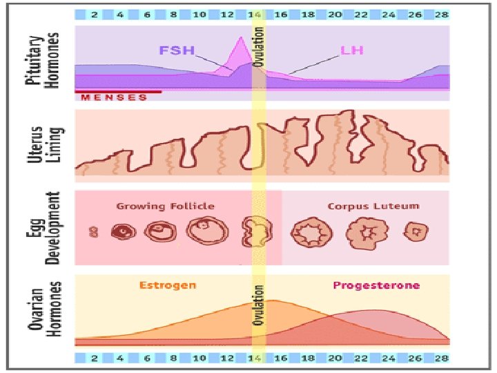 PITUITARY-OVARIAN AXIS �Hormonal interactions between anterior pituitary and ovaries �Anterior pituitary secretes luteinizing hormone (LH) and follicle-stimulating hormone (FSH) �Both promote cyclic changes in the ovaries �Both are controlled by Gn. RH from hypothalamus �FSH secretion slightly greater during early phase of menstrual cycle �LH secretion greatly exceeds FSH secretion prior to ovulation �Not clearly understood but believed to result from negative feedback effects