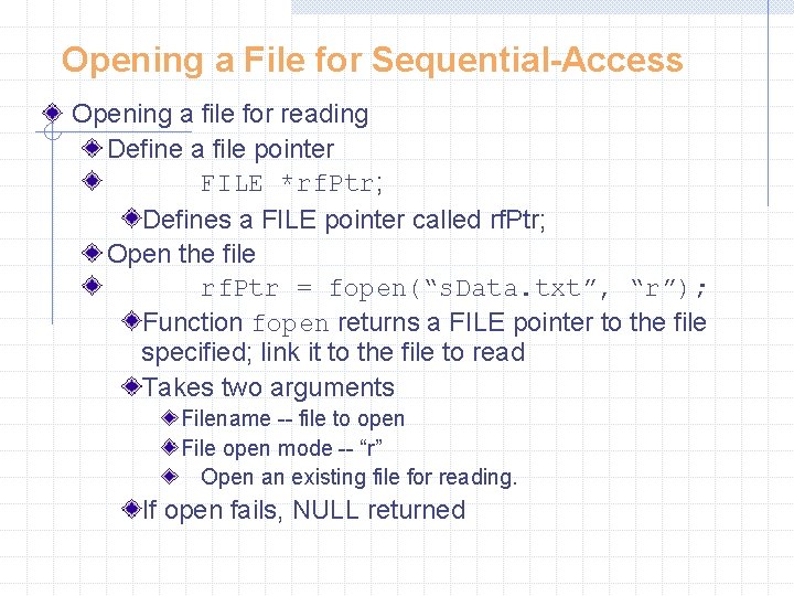 Opening a File for Sequential-Access Opening a file for reading Define a file pointer FILE *rf. Ptr; Defines a FILE pointer called rf. Ptr; Open the file rf. Ptr = fopen(“s. Data. txt”, “r”); Function fopen returns a FILE pointer to the file specified; link it to the file to read Takes two arguments Filename -- file to open File open mode -- “r” Open an existing file for reading. If open fails, NULL returned
