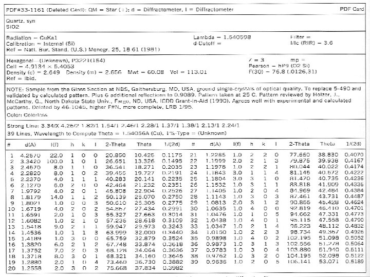 Powder Diffraction Plots θ = arcsin (nλ / 2 d) λ(Cu) = 1. 54Å d - Qtz [101] = 3. 342 θ = 13. 32° ; 2θ = 26. 64° Quartz