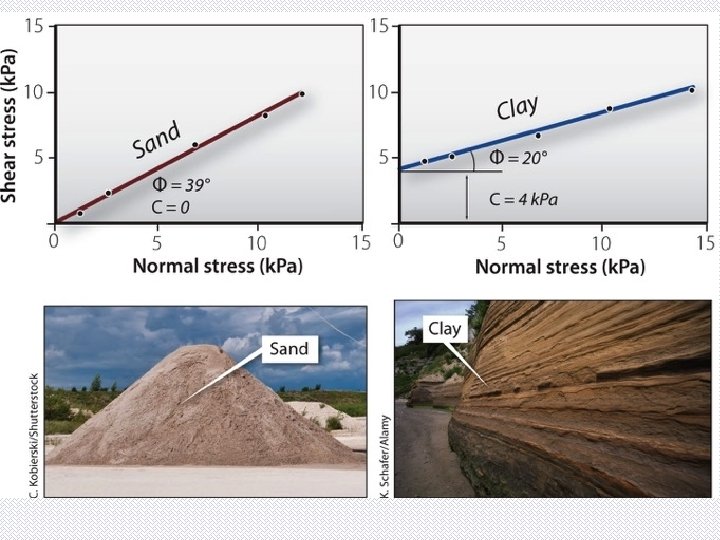 Factors in Slope Stability of a slope expresses the relationship between resisting forces and driving forces • Driving forces (DF) – forces which move earth materials downslope Downslope component of weight of material including vegetation, fill material, or buildings • Resisting forces (RF) – forces which oppose movement Strength of material • The ratio of resisting forces to driving forces is the safety factor (SF): • SF = RF/DF SF > 1 Slope is stable (safe) SF < 1 Slope is unstable (unsafe) Movement occurs when the shear stress exceeds the shear strength of the material.
