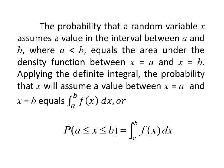 Technically, if we wanted to determine the probability that a normally distributed variable x, having a mean µ and standard deviation , will assume a value between x = a and x = b (a < b), we could determine the probability by integration the density function, or