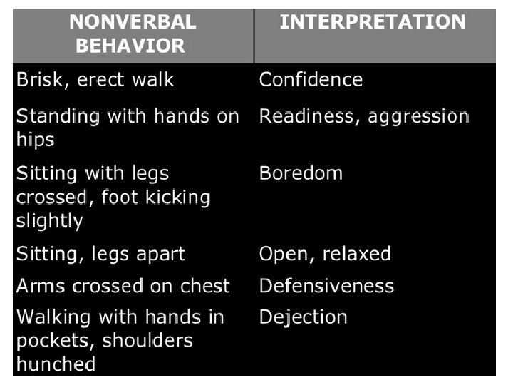 Posture and Body Orientation • Tall and erect communicates energy and purpose whereas slouched and hunched implies tired and lacking in energy. • Looking up is generally regarded as indicative of optimism whilst persistently looking downward suggests secrecy or insecurity.