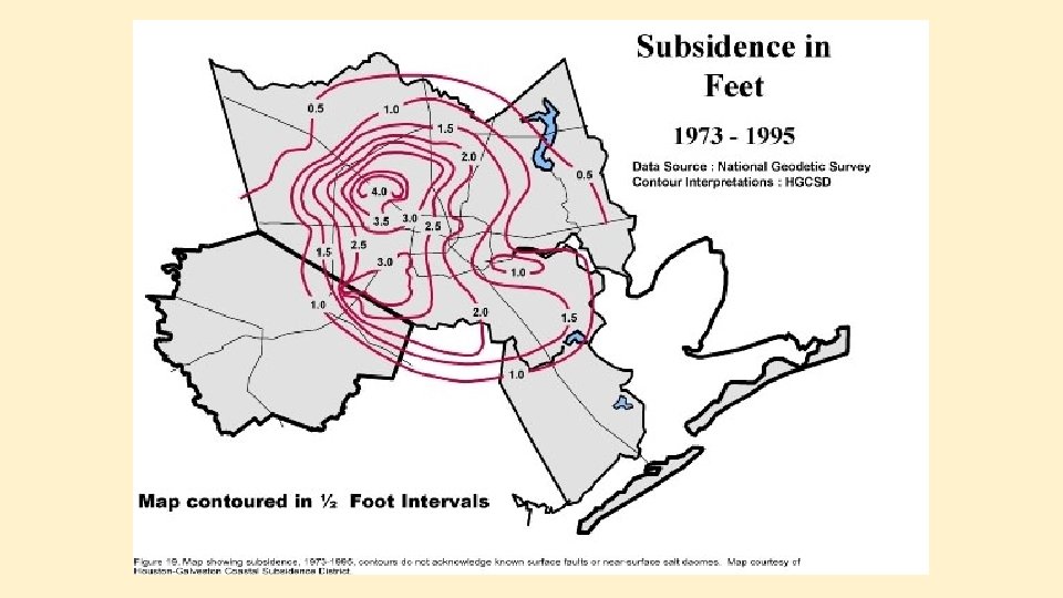 Historic Houston subsidence. Over 3, 200 mi 2 of Houston has sunk at least one foot. The Houston ship canal has sunk 10 ft. Cause: groundwater withdrawal.