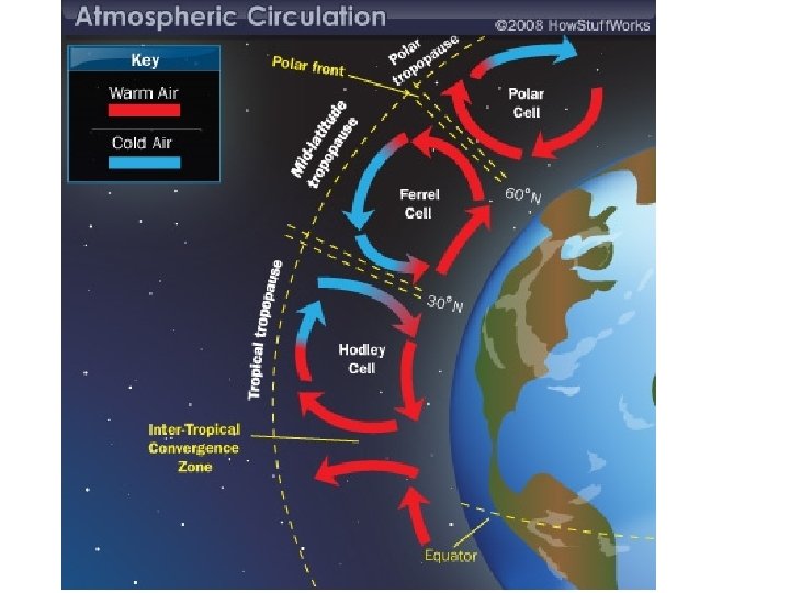 Three key factors at work in global atmospheric circulation 2. The Coriolis force: ü All free-moving objects and fluids on Earth are subject to Coriolis force. ü In the N. H. , winds are deflected to the right. In the S. H. , they're deflected to the left. ü Coriolis force is strongest at the poles and weakest near the equator. ü Wind doesn't merely blow north and south from high to low pressure. Instead, the Coriolis effect forces these airflows to take an easterly or westerly direction. ü This breaks the hemispheric convection cell into three distinct types: Hadley, Ferrel and Polar cells.