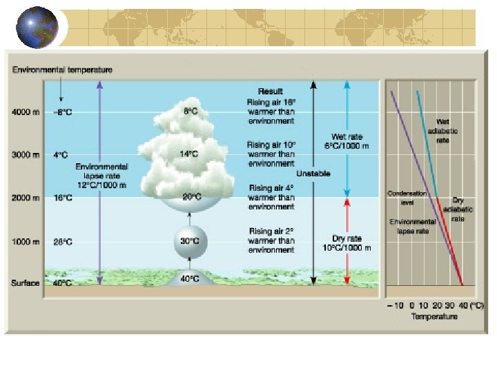Where Z₂ is higher than Z₁, but this presupposes that no heat is added to or lost from the parcel, and condensation, evaporation, and radiative heating can all produce a non-adiabatic system. The dry adiabatic lapse rate, g 0, is a general, thermodynamic property of the atmosphere and expresses the way a parcel of air will cool on rising or warm on falling, provided there is no exchange of heat with the surroundings and no water condensing or evaporating. The environmental lapse rate, G, is seldom equal to exactly the dry adiabatic lapse rate because radiative processes and phase changes constantly redistribute heat. The mean lapse rate is about 6. 5 K/km. Problem left to the students: Derive a new expression for the change in pressure with height for an atmosphere with a constant lapse rate,