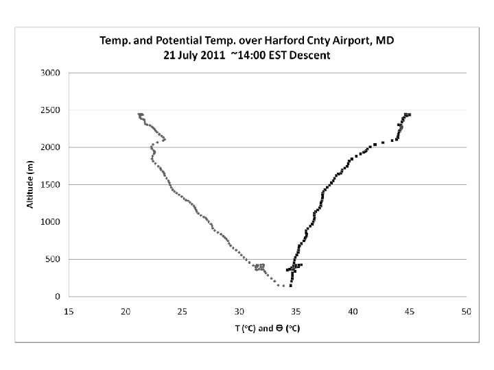Skew-T handout Very important for air pollution and mixing of emissions with free troposphere. Formation of thermal inversions. In the stratosphere the temperature increases with altitude, thus stable or stratified. DFN: Potential temperature, θ : The temperature that a parcel of air would have if it were brought to the 1000 h. Pa level (near the surface) in a dry adiabatic process. You can approximate it quickly, or a proper derivation from dq = Cpd. T – adp = 0 yields: θz = T (1000 h. Pa/Pz) R’/Cp = T (1000 h. Pa/Pz)0. 286