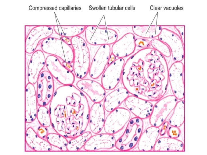 • Microscopically, the features of hydropic swelling of kidney are as under: i) The tubular epithelial cells are swollen and their cytoplasm contains small clear vacuoles and hence the term vacuolar degeneration. These vacuoles represent distended cisternae of the endoplasmic reticulum. ii) Small cytoplasmic blebs may be seen. iii) The nucleus may appear pale. iv) The microvasculature of the interstitium is compressed due to swollen tubular cells.