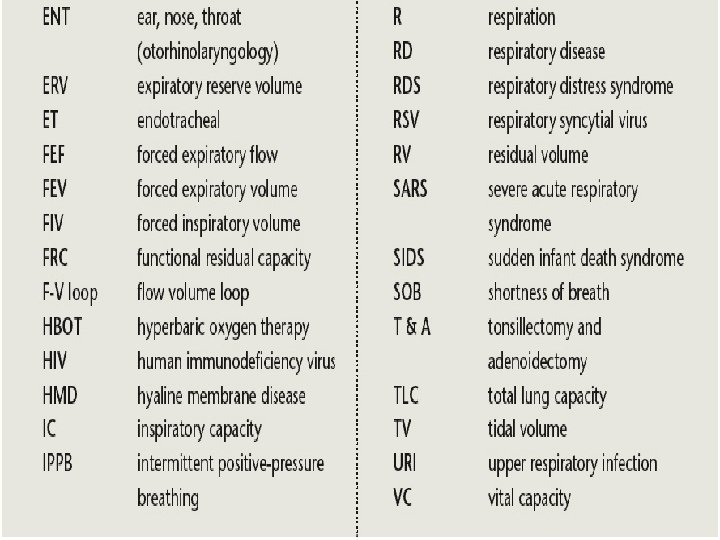 ØPulmonectomy: surgical removal of the lung or a part of a lung. Ø Thoracoplasty: surgical repair of the chest. Ø Thoracotomy: incision into (cutting into) the chest. Ø Tracheostomy: new opening into trachea. ØTracheolaryngotomy: incision into the trachea and larynx. Ø Thoracocentesis: surgical puncture using needle to remove fluid from chest. Ø Ventilator: device used for providing artificial respiration.