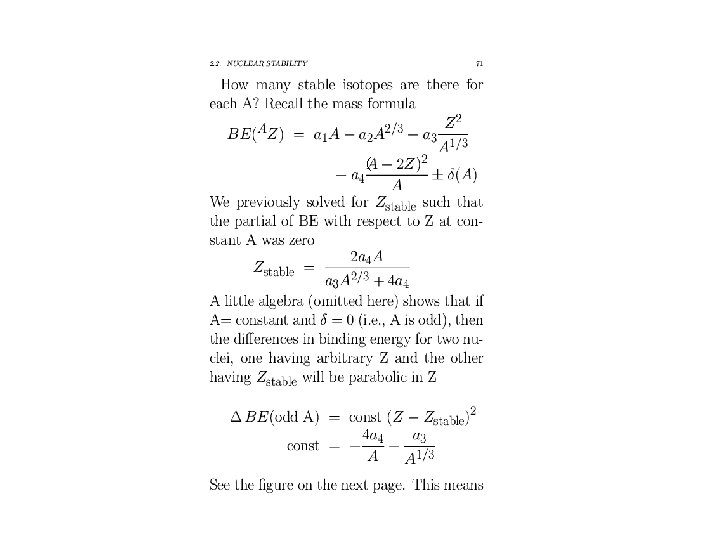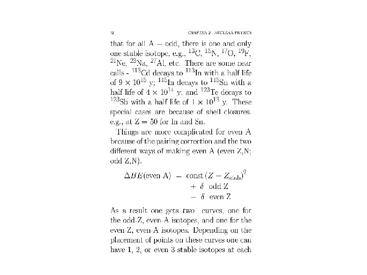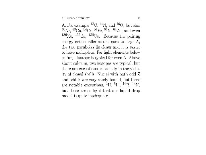 To summarize: odd A There exists one and only one stable isotope odd Z – odd N Very rarely stable. Exceptions 2 H, 6 Li, 10 B, 14 N. Large surface to volume ratio. Our liquid drop model is not really applicable. even Z – even N Frequently one stable isotope (below sulfur). At higher A, frequently 2, and occasionally, 3.
