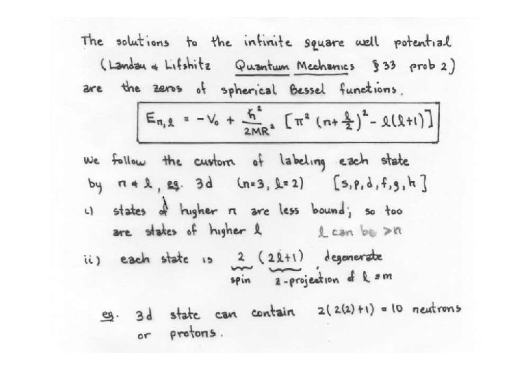 A highly idealized nuclear potential looks something like this “infinite square well”. V -R As is common in such problems one applies boundry conditions to Schroedinger’s equation. 0 R -Vo (In the case you have probably seen before of electronic energy levels in an atom, one would follow the same procedure, but the potential would be the usual [attractive] 1/r potential. ) r