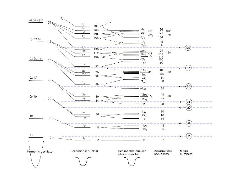 harmonic oscillator infinite square well fine structure splitting closed shells Protons: For neutrons see Clayton p. 315 The closed shells are the same but the ordering of states differs from 1 g 7/2 on up. For neutrons 2 d 5/2 is more tightly bound. The 3 s 1/2 and 2 d 3/2 are also reversed.
