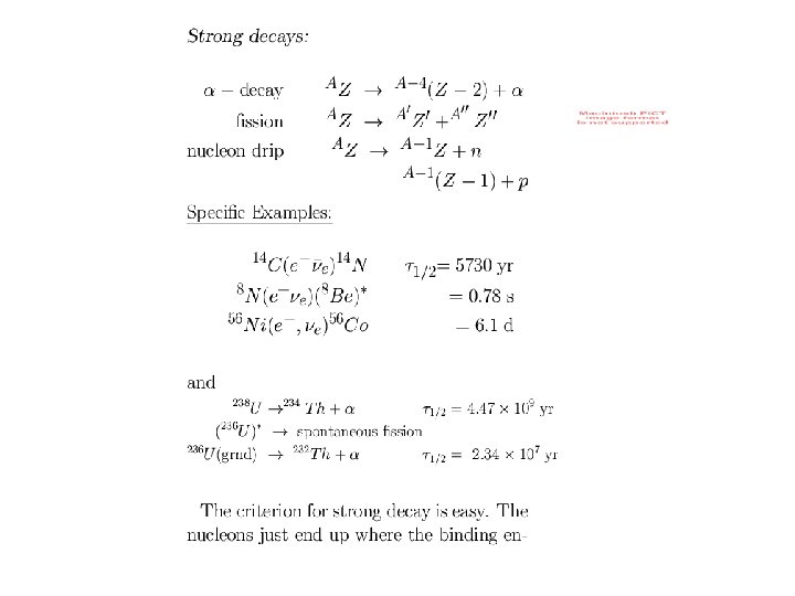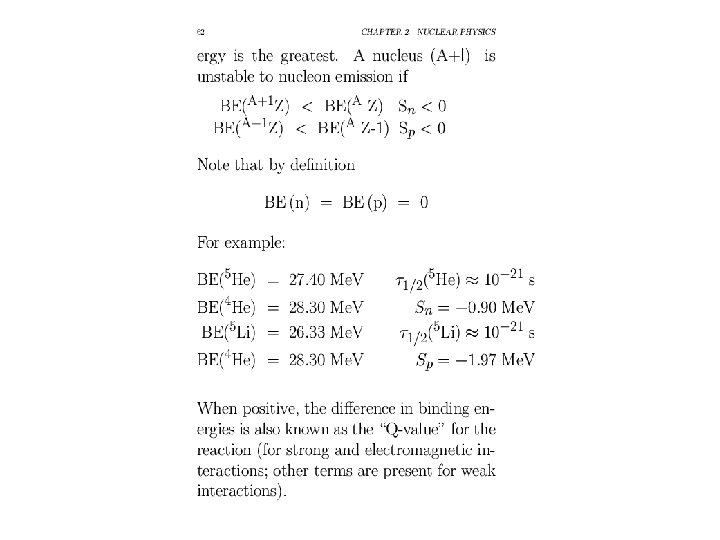 Nuclear Stability A sufficient condition for nuclear stability is that, for a collection of A nucleons, there exists no more tightly bound aggregate. • E. g. , one 8 Be nucleus has less binding energy than two 4 He nuclei, hence 8 Be quickly decays into two heliums. • An equivalent statement is that the nucleus AZ is stable if there is no collection of A nucleons that weighs less. • However, one must take care in applying this criterion, because while unstable, some nuclei live a very long time. An operational definition of “unstable” is that the isotope has a measurable abundance and no decay has ever been observed (ultimately all nuclei heavier than the iron group are unstable, but it takes almost forever for them to decay).
